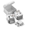 This 3 in 1 travel adaptor is with a square-pin UK plug,a round-pin Euro plug and an adjustable flat-pin plug,these adapter plugs can be used singularly or in combination for all major outlet types.This includes North America,The UK,Europe,Asia Pacific and Australia. The set snaps neatly into the sleeve for compact storage and portability. Material: ABS Plastic or PC Features: For practical traveller, this universal plug adaptor will never leave you in the dark. Unit Size: 6x4x3cm Product Color: Black,white,blue,red etc. As you wish Logo Imprint: 40x25 mm Packaging: white paper box or as your requirement Remarks: 100pcs/ctn ; carton size:44*27*31CM ; G.W:11kgs